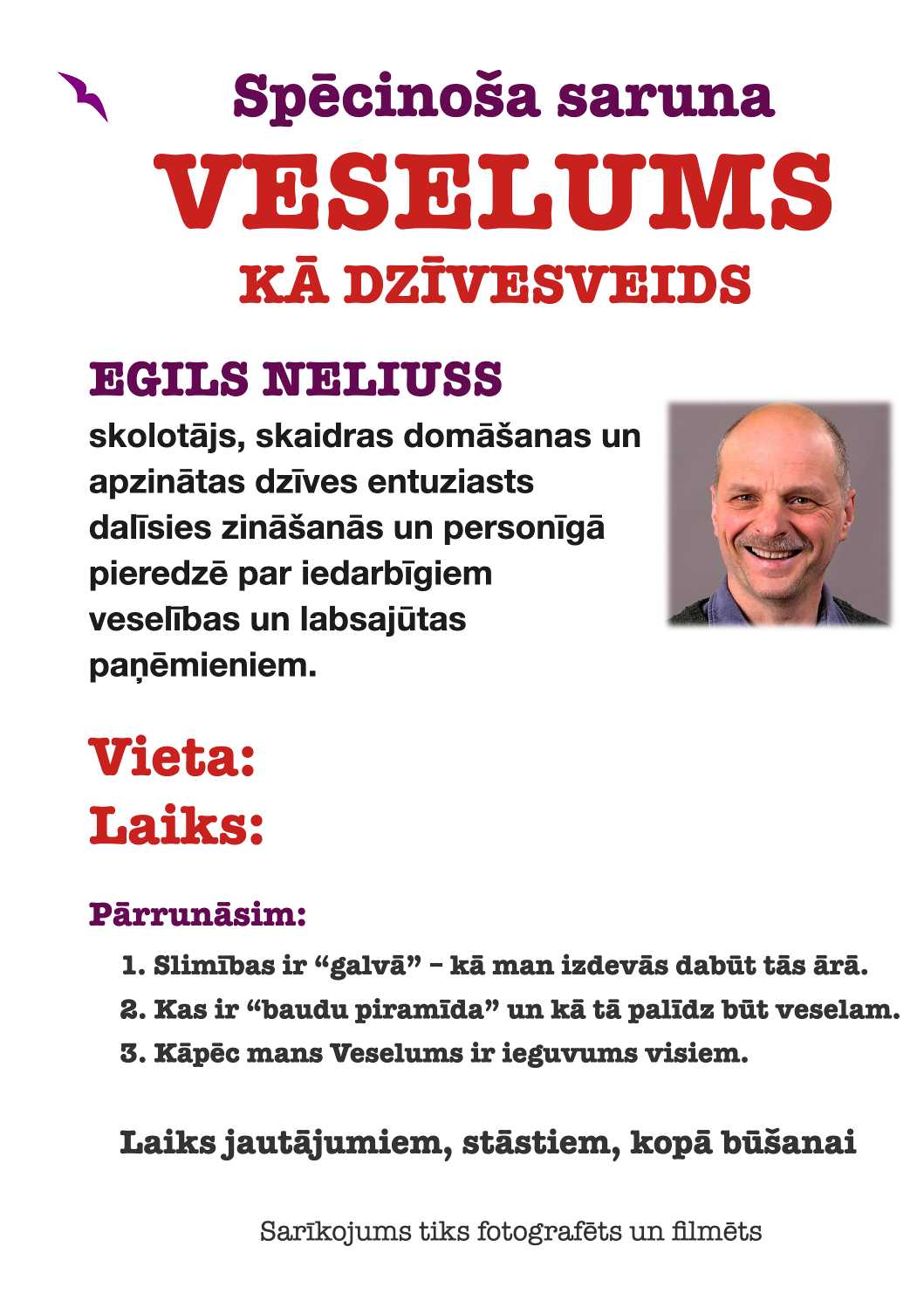 Bet vislielāko prieku un gandarījumu gūstu no sarunas klātienē. Esmu izveidojis šo 100 minūšu prezentāciju – spēcinošu sarunu par to, kā ieguvu Veselumu, kādus šķēršļus pārvarēju, kā arī to, kā dzīve izskatās tagad, kad Veselums man jau ir.