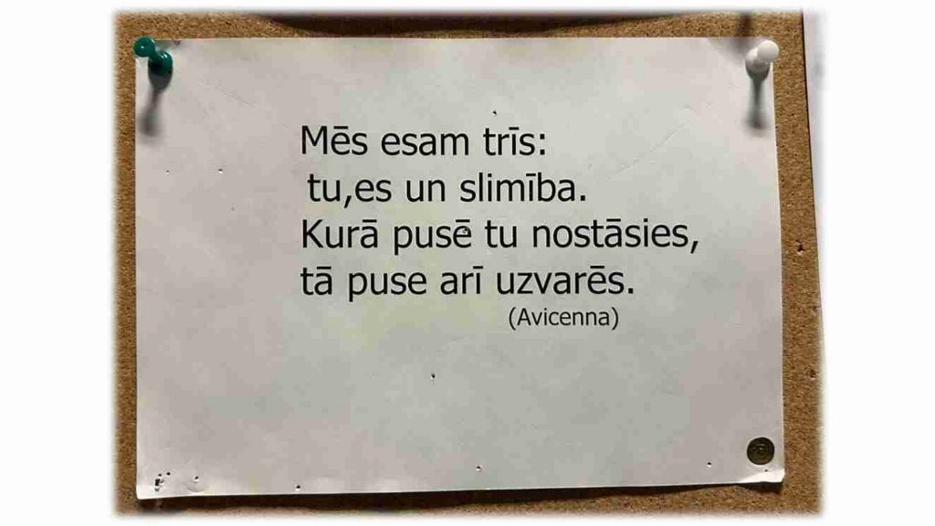 Pie manas ģimenes ārstes kabineta ir zīmīte “Šeit esam mēs trīs – es – dakteris, tu – slimnieks un slimība. Kurā pusē tu nostāsies, tā ari uzvarēs.”
