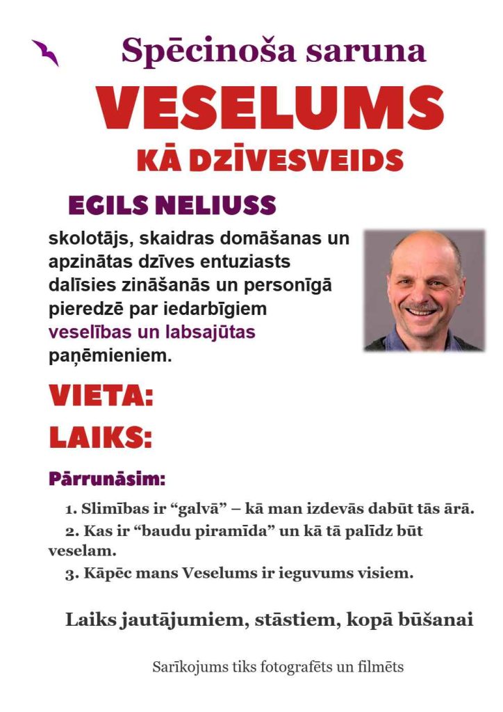 EGILS NELIUSS, skolotājs, skaidras domāšanas un apzinātas dzīves entuziasts dalīsies zināšanās un personīgā pieredzē par iedarbīgiem veselības un labsajūtas paņēmieniem.